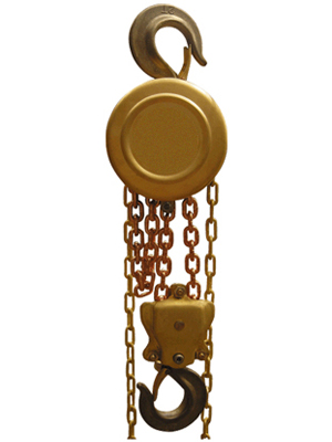 通過拽動手拉鏈條帶動手拉鏈輪、摩擦片、棘輪、制動器座、五齒長軸、片齒輪、短軸齒輪、花鍵孔齒輪、起重鏈輪轉動,最終帶動起重鏈條平穩的吊運重物。